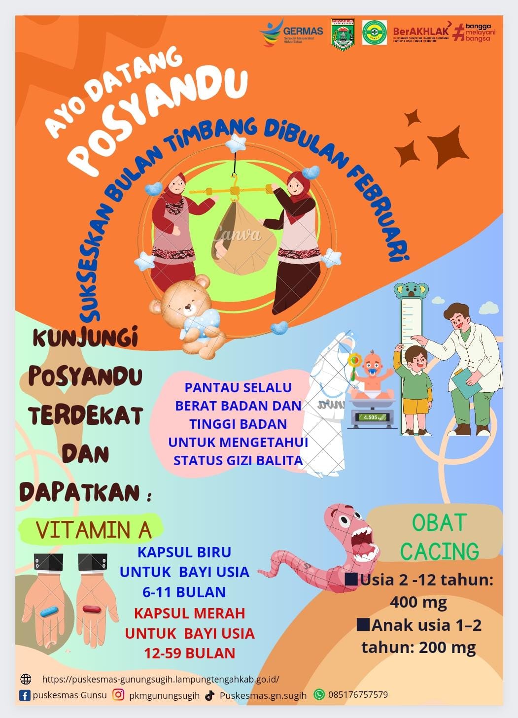 Bulan Febuari jadwal pembagian Vitamin A dan Obat cacing. Ada 2 jenis vitamin A kapsul biru untuk 6-11 bulan dan kapsul merah 12-59 bulan. Pemberian vitamin A ini untuk meningkatkan daya tahan tubuh terhadap penyakit dan infeksi seperti campak dan diare serta membantu proses penglihatan dalam adaptasi terang ke gelap. pemberian vitamin A perlu diiringi pemberian obat cacing agar penyerapan zat gizi sempurna.