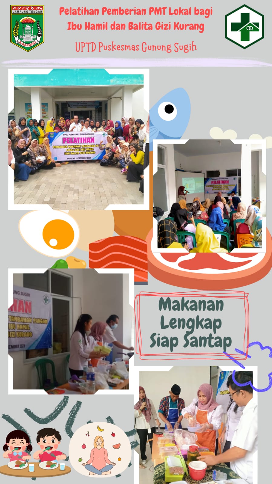 pemberian makanan tambahan ( PMT) berbasis pangan lokal adalah makanan tambahan pangan lokal yang diberikan untuk meningkatkan status gizi pada balita dan ibu hamil KEK. Pelatihan ini diperuntukan untuk kader Posyandu diwilayah kerja Puskesmas Gunung Sugih bertujuan untuk meningkatkan pengetahuann dan keterampilan kader dalam pemberian makanan tambahan berbasis lokal.